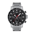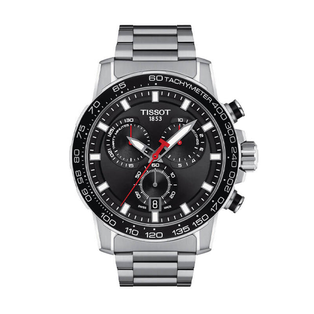 El Tissot Supersport Chrono es un reloj análogo para hombre que refleja fuerza, precisión y estilo deportivo. Su caja de acero inoxidable de 46 mm y su esfera negra con detalles en blanco y rojo transmiten energía y dinamismo en cada detalle.