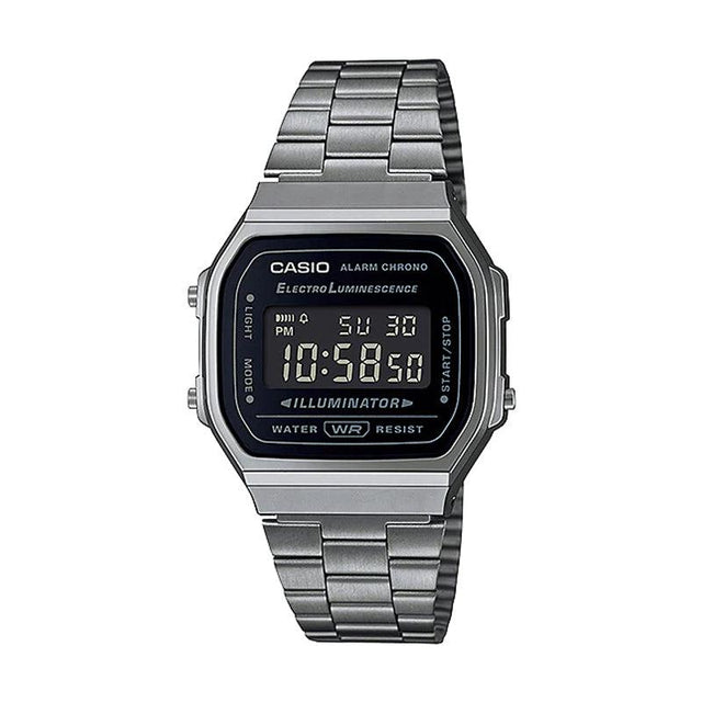 El Casio A-168WGG-1B es un reloj digital unisex de estilo retro con presencia audaz. Su caja rectangular en tono gris grafito mate y carátula negra espejada le dan un look moderno con inspiración vintage. La correa de acero inoxidable a juego refuerza su estética monocromática. Incluye cronómetro, alarma, calendario automático y luz LED. Ideal para el uso diario o para quienes buscan un accesorio distintivo con actitud urbana.