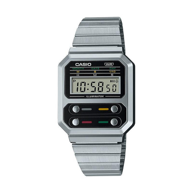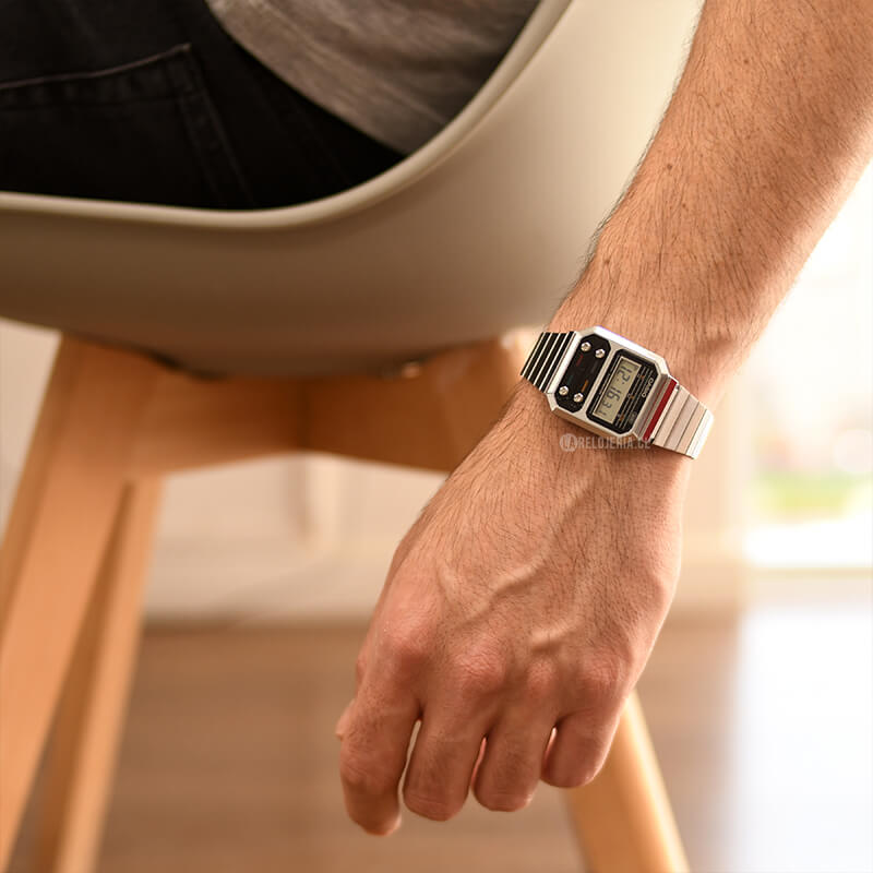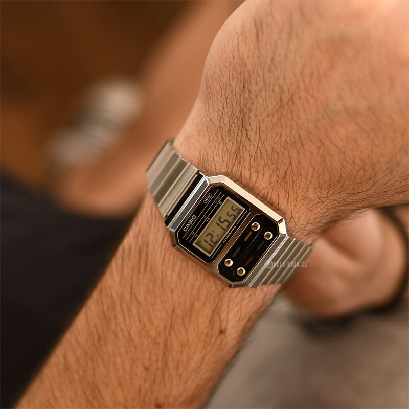 El Casio A100WE-1A combina estilo retro y funciones esenciales para el uso diario. Incorpora pantalla digital con luz LED, cronómetro de 1/10 segundos, alarma diaria, señal horaria y calendario automático. Su caja de resina con acabado metálico y correa de acero inoxidable ajustable brindan comodidad y durabilidad. Tiene resistencia al agua de 3 BAR (30 m), adecuada para salpicaduras ocasionales. El diámetro de caja es de aproximadamente 33 mm, con movimiento de cuarzo digital. Ideal para quienes buscan un reloj confiable, liviano y con diseño vintage para complementar un estilo casual o urbano.