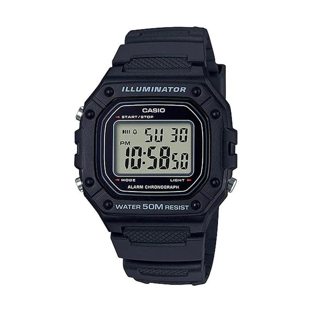 El Casio W-218H-1AV es un reloj digital funcional con diseño clásico y resistente. Su caja cuadrada de resina negra, combinada con una pantalla de fácil lectura, mantiene el estilo retro en un formato robusto y cómodo.