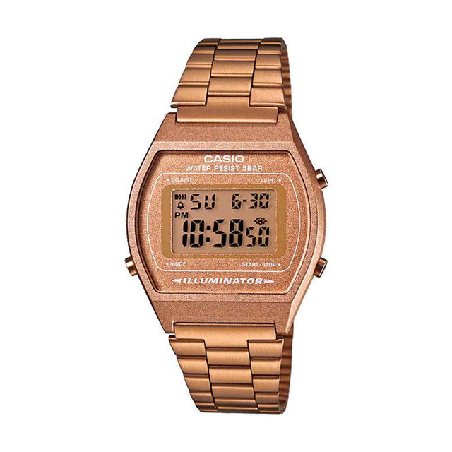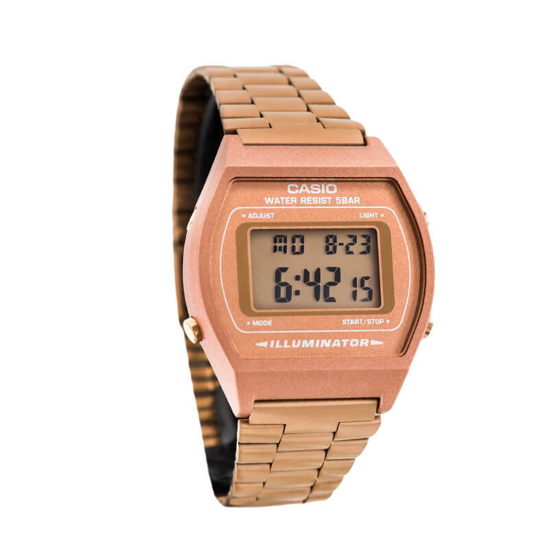 El Casio B640WC-5A reinventa el estilo retro con un toque moderno y elegante. Este reloj digital unisex destaca por su acabado metálico en tono rose gold, que aporta un look sofisticado y contemporáneo sin perder la esencia vintage de los clásicos Casio.