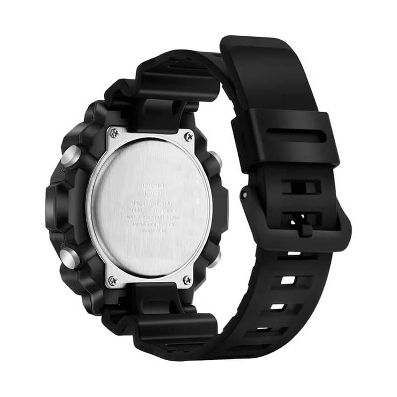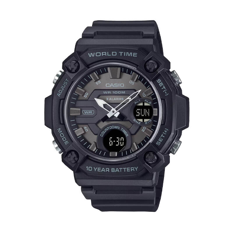 El Casio AEQ-120W-1BVDF destaca por su caja de resina negra con bisel ancho y marcadores en relieve, acompañada de una correa de resina duradera y ligera. Su esfera combina display analógico con pantalla digital, logrando un estilo moderno y funcional que equilibra robustez y facilidad de lectura.