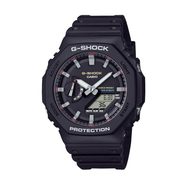 El G-SHOCK GA-2100RL-1ADR es un reloj análogo-digital unisex de diseño octogonal, con una estética deportiva y contemporánea. Su caja negra mate se combina con una correa textil negra con costuras rojas que le da un toque distintivo, ideal para un look casual con actitud.