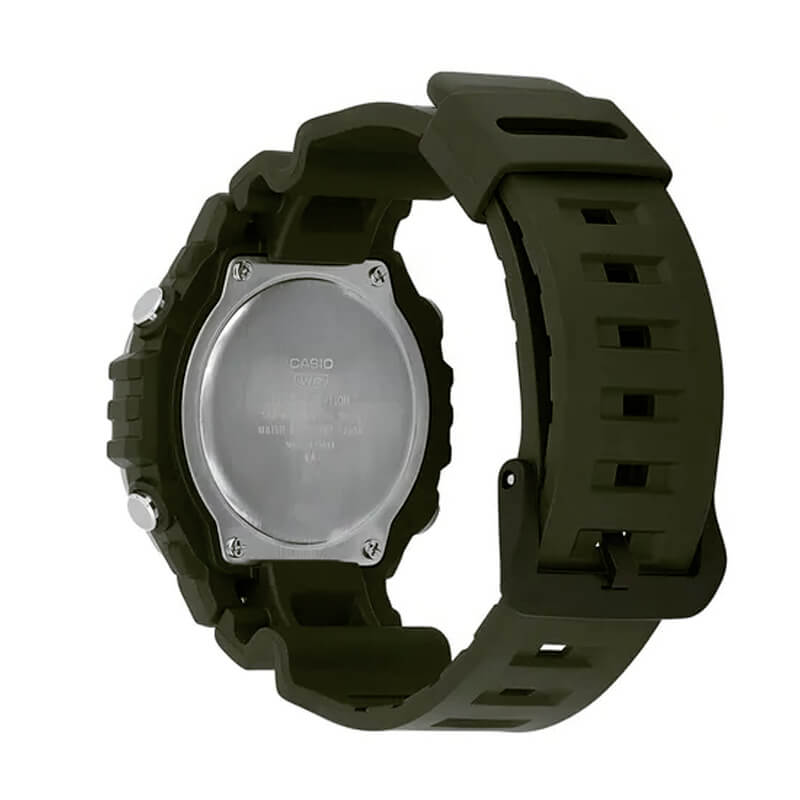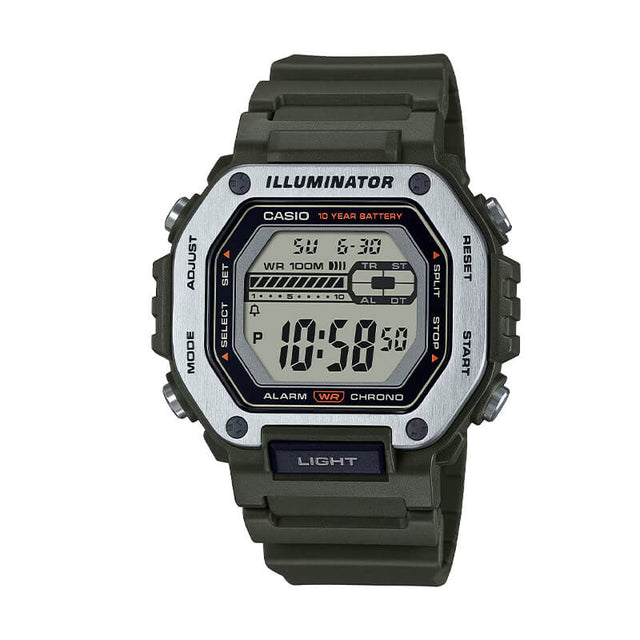 El Casio MWD-110H-3AV presenta una caja de resina negra de gran tamaño con bisel metálico plateado, complementada por una correa de resina verde militar que refuerza su carácter deportivo. Su pantalla digital amplia y de alto contraste ofrece una lectura clara y moderna, ideal para un estilo urbano y outdoor.
