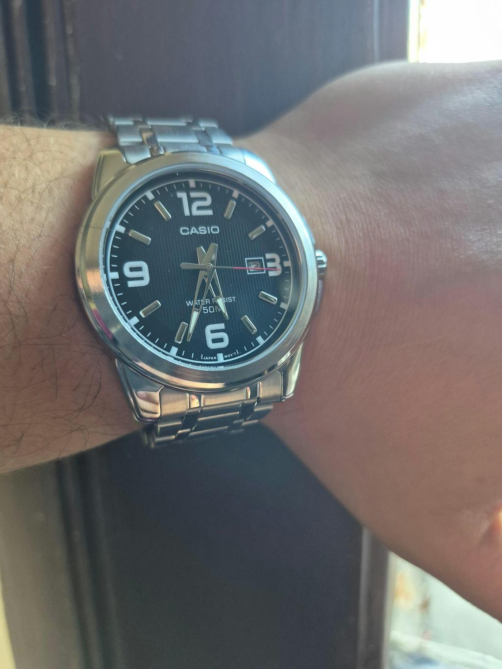 El Casio MTP-1314D-1AV destaca por su esfera negra amplia con números grandes y marcadores luminosos, que permiten una lectura precisa incluso en condiciones de poca luz. La ventana de fecha a las 3 añade funcionalidad sin recargar el diseño.