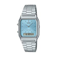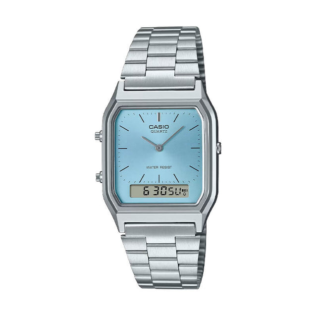 El Casio AQ-230A-2A1 revive el encanto vintage con su diseño rectangular clásico y una esfera análoga azul marino combinada con pantalla digital. Esta fusión ofrece lo mejor de ambos mundos, hora dual, alarma diaria, cronómetro y calendario automático, todo en un formato compacto y elegante.