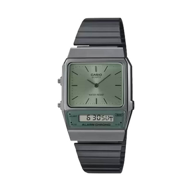 El Casio AQ-800ECGG-3A reinterpreta un diseño vintage con un estilo urbano y actual. Su carátula verde oliva combina pantalla análoga y digital en una caja rectangular de acero con acabado gris grafito. La correa tipo malla metálica completa un look industrial elegante. Incluye cronómetro, alarma, calendario automático y formato 12/24 h. Ideal para quienes buscan funcionalidad retro con estética contemporánea.