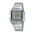 El Casio DB-360-1A combina una caja rectangular plateada en resina cromada con brazalete metálico de acero inoxidable, logrando un diseño clásico y elegante de la serie Data Bank. Su pantalla digital negra con caracteres claros ofrece una excelente legibilidad y refuerza su estilo retro tecnológico.
