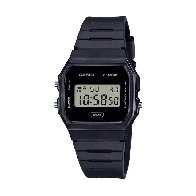 El Casio F-91WB-1A es un reloj digital unisex que mantiene el diseño clásico del F-91W, ahora con un acabado completamente negro para un look más sobrio y versátil. Su caja rectangular de resina y pantalla clara hacen de este modelo una opción liviana, cómoda y funcional para el uso diario.
