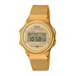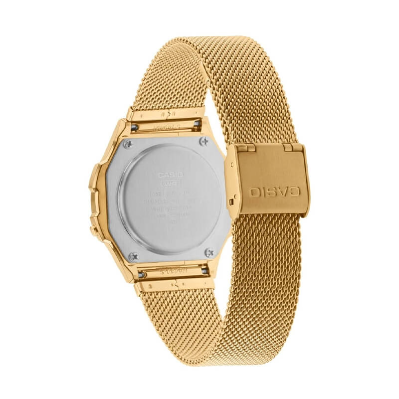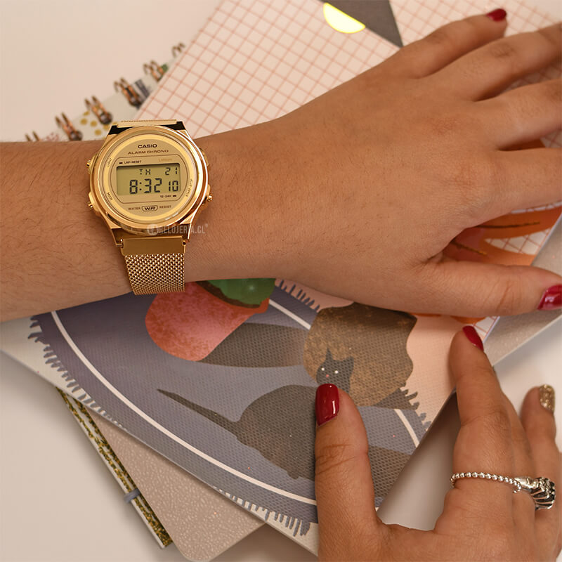 El Casio A-171WEMG-9A destaca por su estética retro refinada, con caja redonda en acabado dorado y correa de malla metálica ajustable. Su pantalla digital minimalista mantiene la esencia vintage con funciones esenciales como cronómetro, alarma diaria, calendario automático y luz LED. Liviano y cómodo, combina diseño clásico con un toque de sofisticación moderna. Ideal para quienes buscan un reloj con carácter nostálgico y estilo elegante.