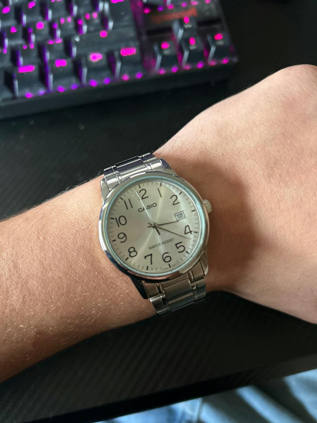 El Casio MTP-V002D-7B presenta una caja de resina cromada plateada con brazalete de acero inoxidable, logrando un estilo clásico y atemporal. Su esfera blanca con números negros y ventana de fecha a las 3 ofrece una lectura clara y precisa, con un diseño sobrio que refuerza su elegancia tradicional.