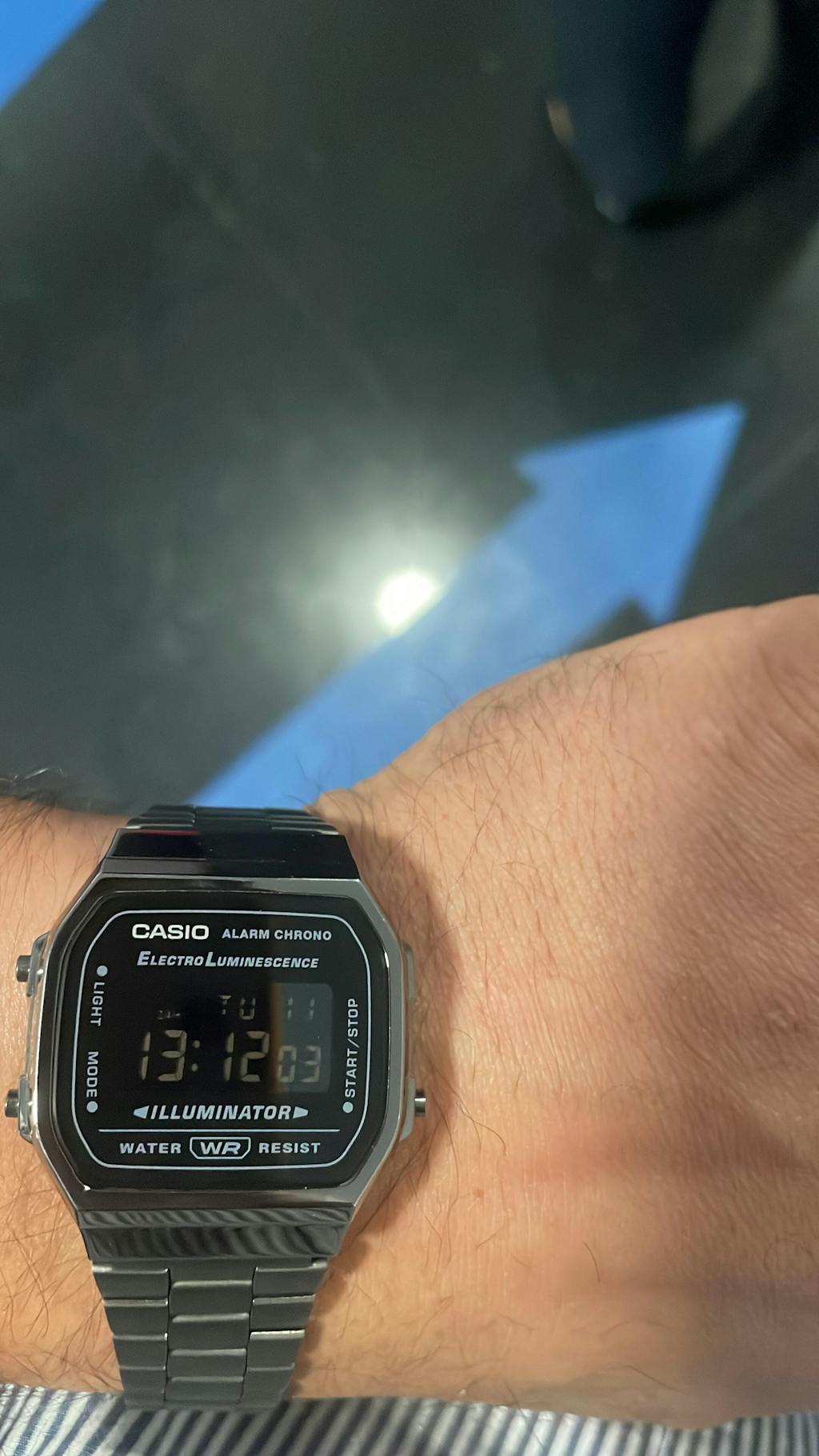 El Casio A-168WGG-1B es un reloj digital unisex de estilo retro con presencia audaz. Su caja rectangular en tono gris grafito mate y carátula negra espejada le dan un look moderno con inspiración vintage. La correa de acero inoxidable a juego refuerza su estética monocromática. Incluye cronómetro, alarma, calendario automático y luz LED. Ideal para el uso diario o para quienes buscan un accesorio distintivo con actitud urbana.