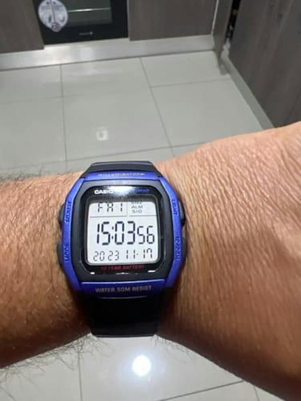 El Casio W-96H-2AV es un reloj digital funcional y resistente, con caja de resina negra y detalles azul marino que le dan un estilo deportivo discreto. Su pantalla amplia permite una lectura clara de hora, fecha, día y segundos.