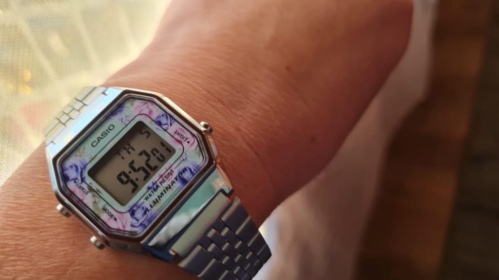 El Casio LA-680WA-2C es un reloj digital femenino de inspiración retro, con caja rectangular cromada y carátula con flores que aporta un toque fresco y juvenil. Su correa de acero inoxidable ajustable lo hace cómodo y ligero para el uso diario. Incluye funciones prácticas como cronómetro, alarma, calendario automático y luz LED. Ideal para complementar looks casuales con un estilo vintage moderno.