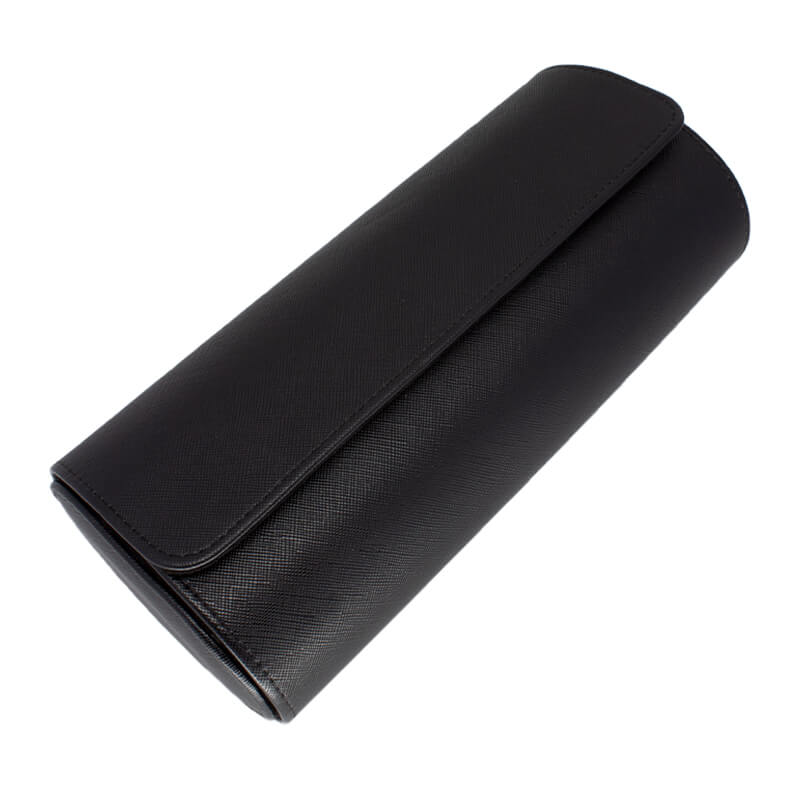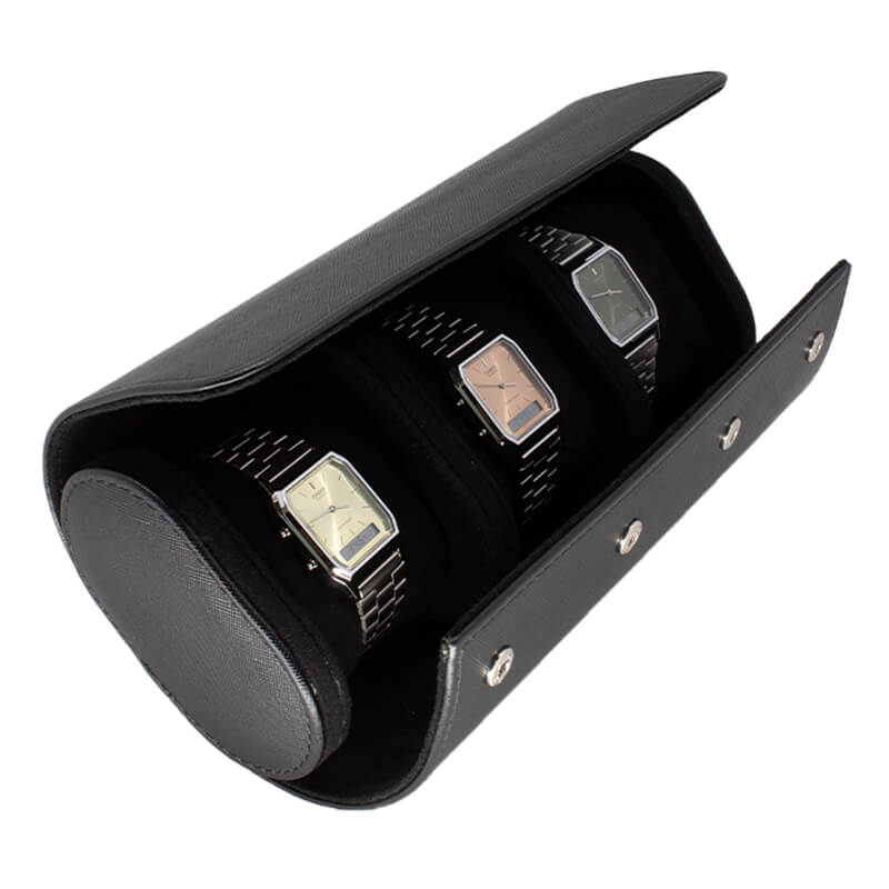 Guarda y transporta tus relojes con elegancia y seguridad con el Organizador La Relojería para 3 Relojes. Fabricado en cuero sintético negro con textura suave, cuenta con tres compartimentos acolchados y extraíbles que protegen cada pieza de golpes y rayas. Su diseño cilíndrico con cierre a presión lo hace ideal para viajes o para mantener tu colección ordenada en casa. Un accesorio práctico, resistente y sofisticado para los amantes de la relojería.