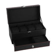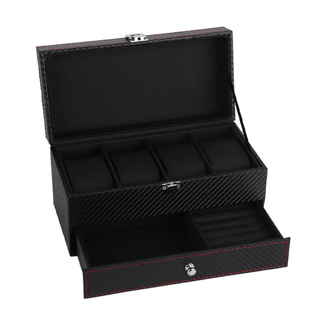 Guarda y protege tus relojes y accesorios con estilo gracias al Organizador La Relojería para 4 Relojes y Joyas. Fabricado en elegante acabado negro con textura tipo fibra de carbono, cuenta con compartimentos acolchados para 4 relojes y un cajón inferior ideal para joyas, pulseras o anillos. Su interior forrado en suave terciopelo protege cada pieza de rayas y golpes. Un complemento funcional y sofisticado, perfecto para mantener tu colección siempre ordenada y segura.