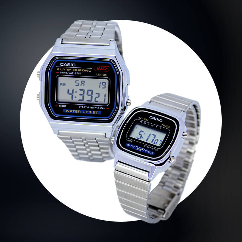 Ambos relojes mantienen la esencia ochentera que los convirtió en íconos, pero con funciones prácticas como alarma, cronómetro, calendario automático y resistencia al agua, ideales para el día a día. Es el dúo perfecto para parejas, fanáticos del estilo retro o quienes simplemente quieren volver a lo esencial con personalidad.