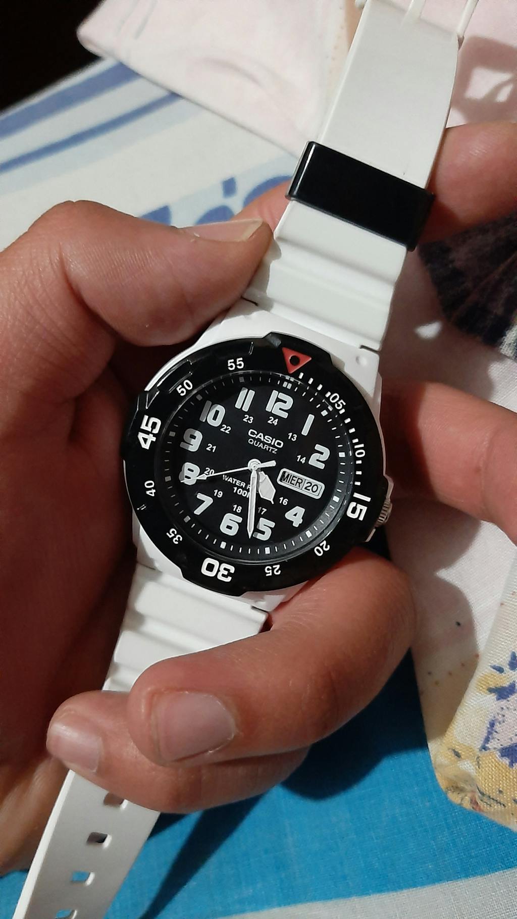 Diseño deportivo y moderno con caja ligera de resina blanca que aporta resistencia y comodidad. Su esfera negra, combinada con marcadores grandes en tonos vibrantes, ofrece un look fresco y fácil de leer, acompañado de agujas luminosas ideales para baja luz. La correa blanca mantiene un estilo versátil para uso diario. Con movimiento de cuarzo japonés y resistencia al agua de 100 m, es un reloj práctico, confiable y perfecto para un estilo activo.