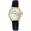 La caja dorada y la correa oscura de estilo cuero crean una combinación distinguida, ideal para acompañar el uso diario con un toque clásico.