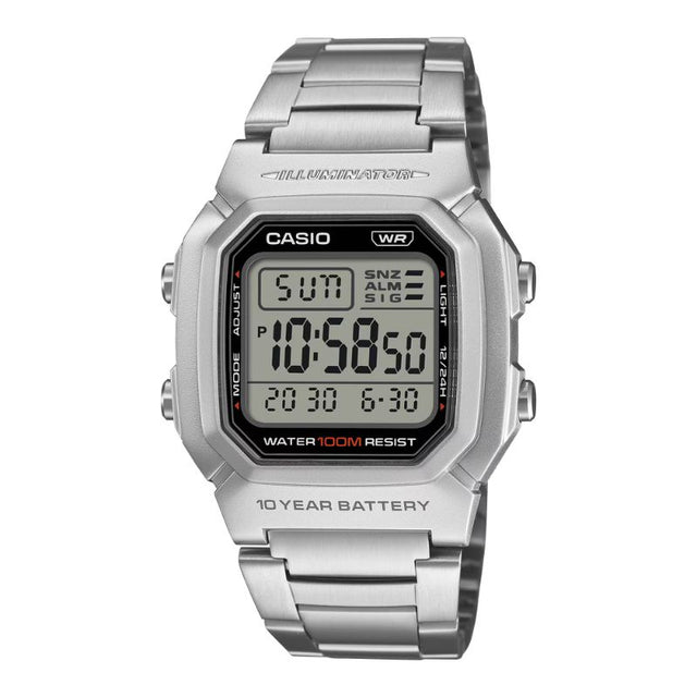 Reloj Casio con caja de acero inoxidable, pantalla digital y funciones prácticas para el hombre activo.