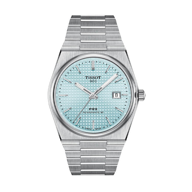 Tissot PRX Powermatic 80 combina el diseño icónico de los años 70 con la elegancia de un reloj automático moderno. Su esfera color ice blue con acabado cepillado se funde con una caja de acero inoxidable y brazalete integrado, logrando una silueta elegante y atemporal.