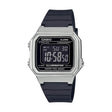 El Casio W-217HM-7BV actualiza el diseño digital clásico con una carátula plateada que resalta sobre la caja y correa de resina negra. Su formato rectangular y pantalla de alto contraste facilitan la lectura rápida.