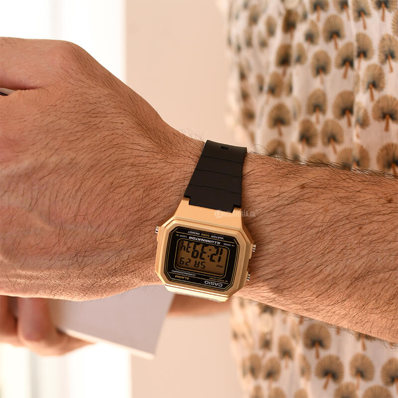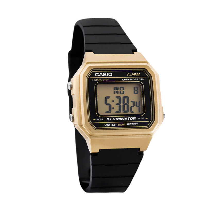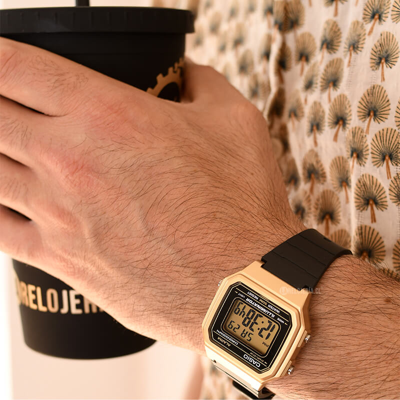 El Casio W-217HM-9AV combina el estilo digital clásico con una estética llamativa gracias a su carátula dorada en contraste con la caja y correa de resina negra.