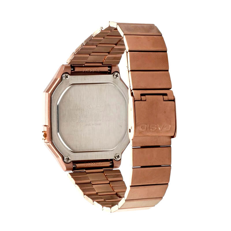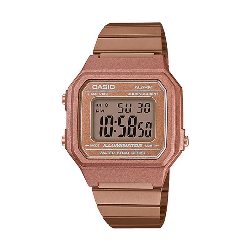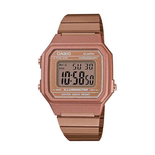 El Casio B-650WC-5A es un reloj digital que combina un estilo retro con una construcción moderna. Su caja de resina en color oro rosa y la correa de resina a juego ofrecen un diseño elegante y ligero. La pantalla LCD digital proporciona una lectura clara de la hora, la fecha y otras funciones, mientras que la retroiluminación LED asegura visibilidad en condiciones de poca luz. Este reloj es ideal para quienes buscan un accesorio práctico y con estilo para el uso diario.