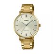 El Casio LTP-VT01G-9B combina una caja de resina dorada con brazalete de acero inoxidable a tono, logrando un diseño elegante y llamativo. Su esfera dorada satinada con índices lineales refuerza su estilo minimalista y refinado.
