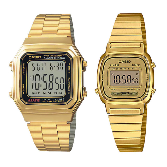 Celebra lo clásico, lo atemporal y lo icónico con este pack de relojes Casio dorados para parejas. Una edición retro que no solo marca la hora, sino también el estilo. ⏳✨
