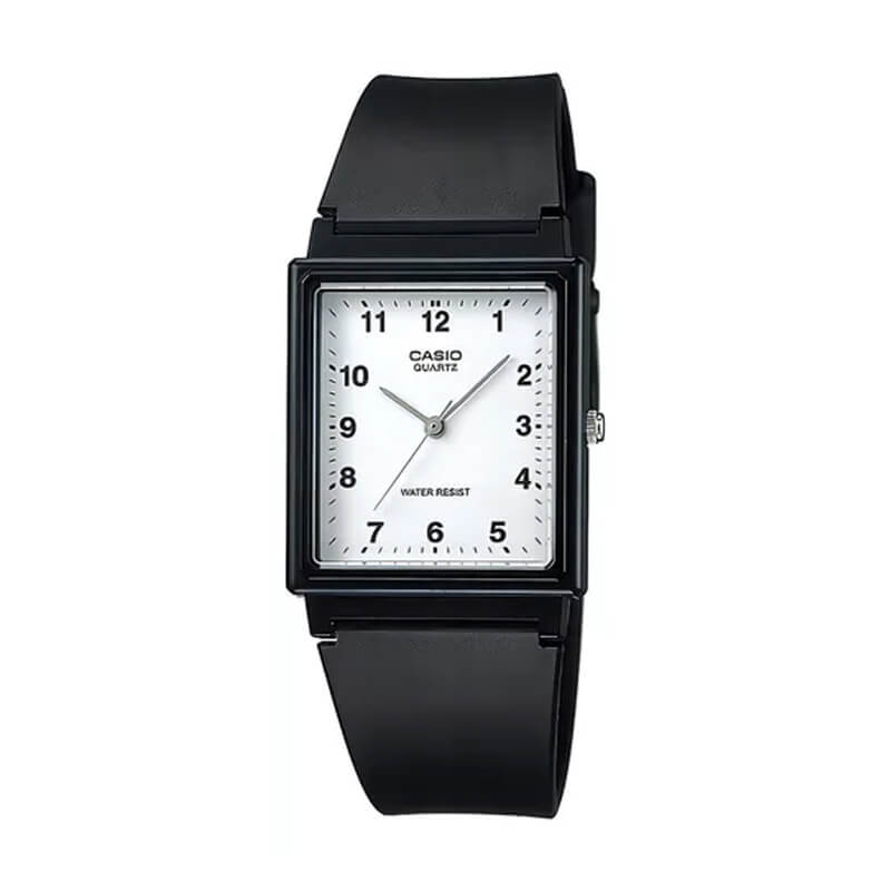El Casio MQ-27-7B presenta una caja rectangular plateada tipo Cartier Tank en resina con correa de resina negra, logrando un diseño sobrio y ligero. Su carátula blanca minimalista con índices negros y manecillas en contraste refuerza un estilo clásico y elegante de inspiración retro.