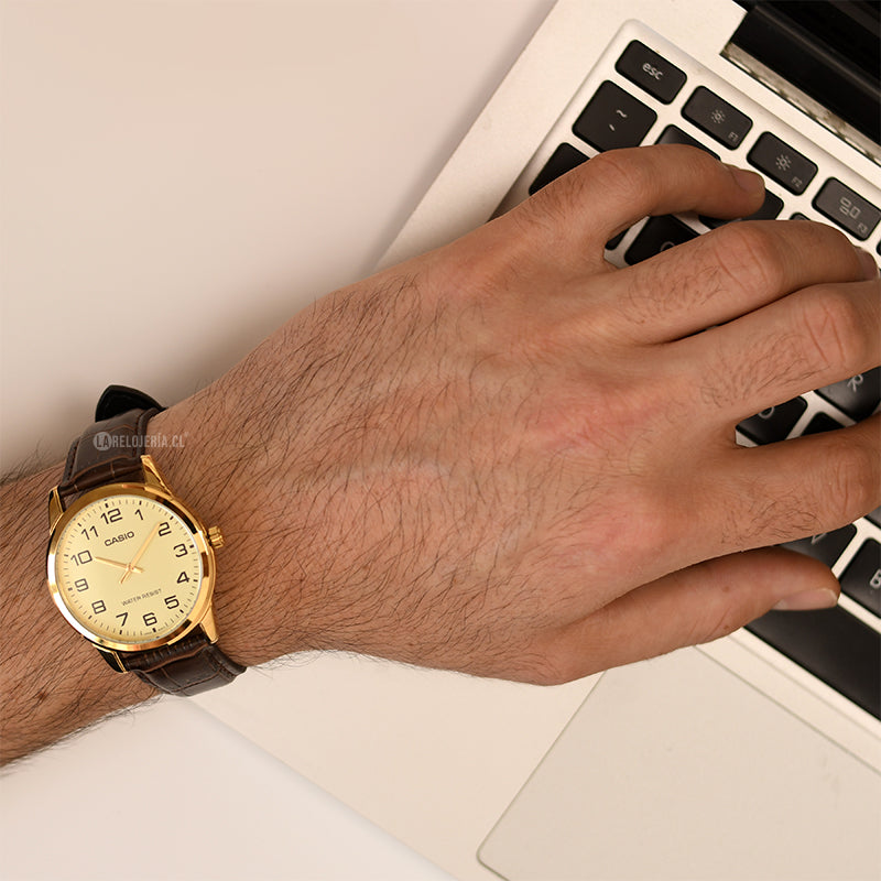 La correa de cuero sintético en tono café oscuro complementa el diseño con sobriedad y versatilidad, ideal para el uso diario o situaciones más formales. Equipado con movimiento de cuarzo japonés, garantiza precisión respaldado por la confiabilidad de Casio.