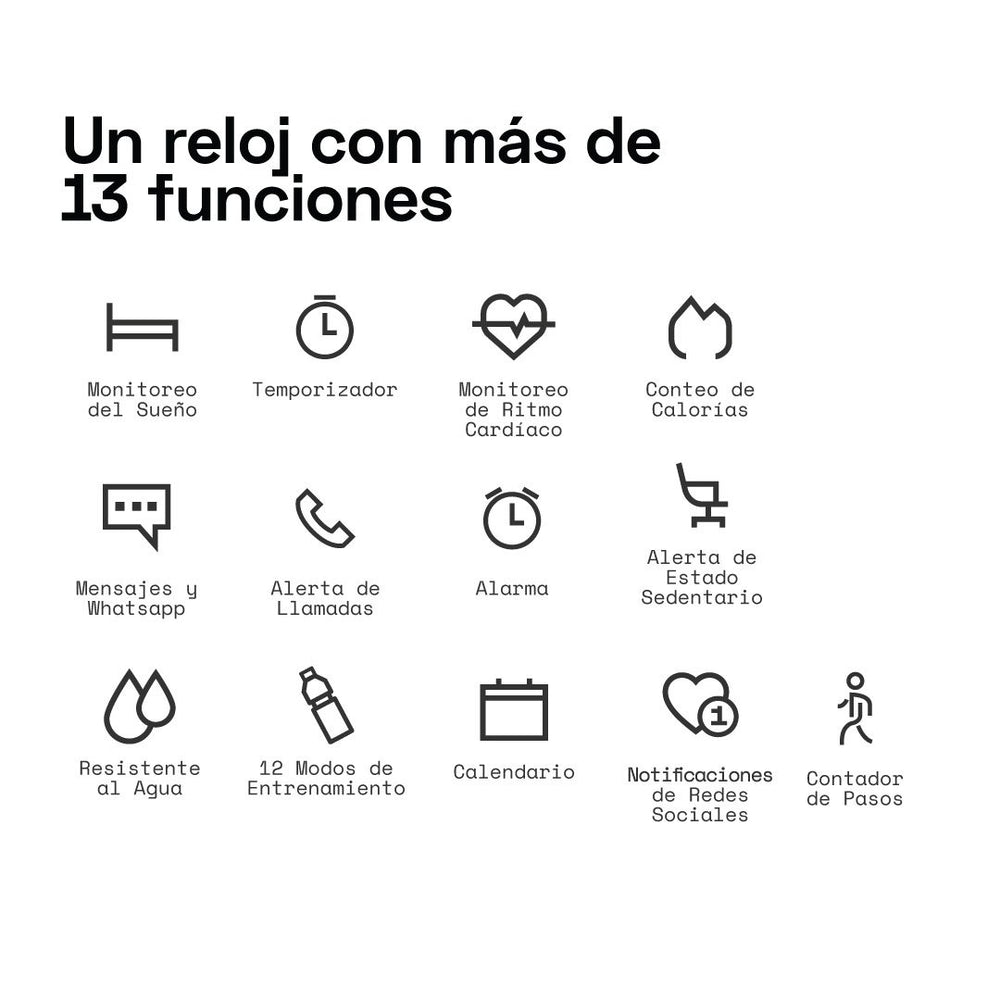 | Funciones | Fecha, Alarma, Calendario, Cronómetro, Hora Mundial, Luz LED, Brújula, Temporizador