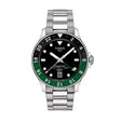 Su movimiento de cuarzo incorpora función GMT, permitiendo leer dos zonas horarias al mismo tiempo, perfecta para aventureros y viajeros frecuentes. La caja de acero inoxidable y el brazalete a juego aportan presencia y durabilidad, mientras que la esfera negra con detalles luminiscentes y el bisel giratorio unidireccional aseguran máxima visibilidad y control. El cristal de zafiro con tratamiento antirreflejo protege la carátula frente a rayaduras.