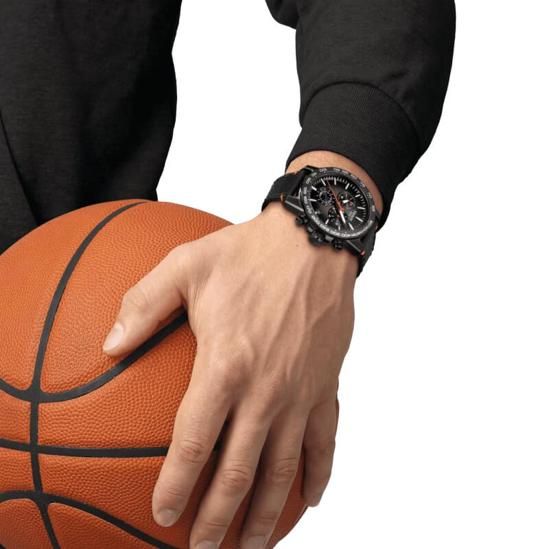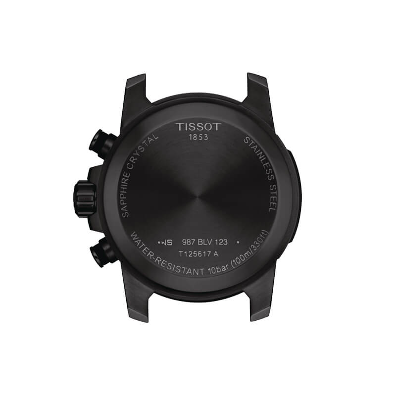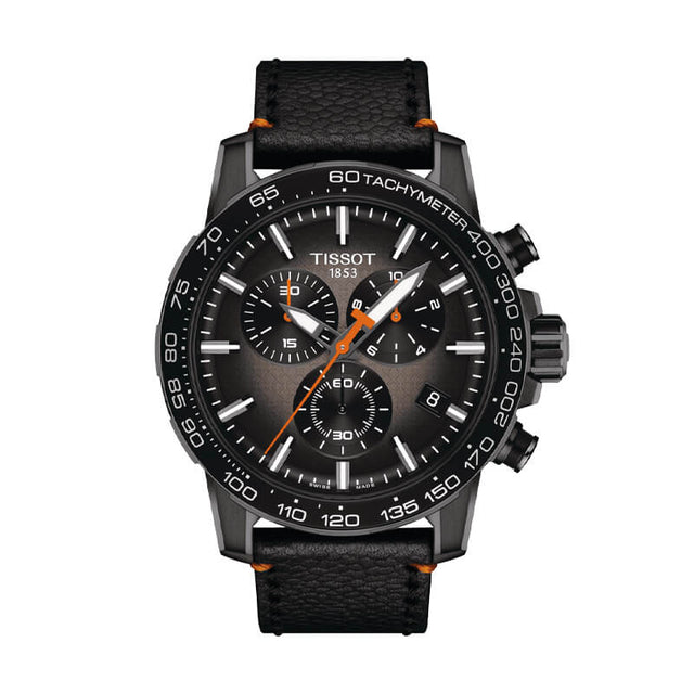 El Tissot Supersport Chrono es un reloj análogo para hombre que destaca por su diseño deportivo con un toque clásico y sofisticado. Su esfera negra con subesferas integradas, detalles en blanco y naranja, y agujas luminiscentes ofrece una lectura clara y precisa, incluso en condiciones de baja luz.