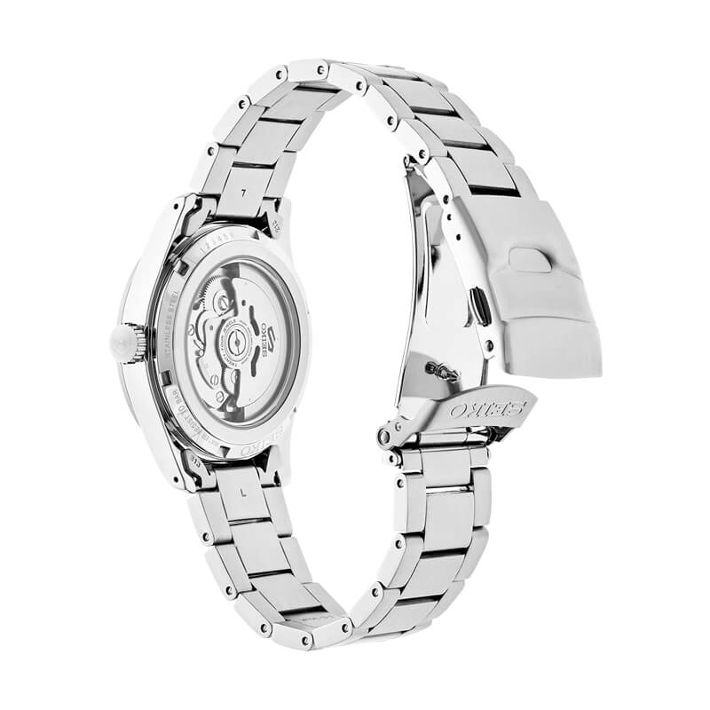 Su movimiento automático japonés garantiza precisión y fiabilidad, visible a través del fondo transparente. Con resistencia al agua de 100 m, es una pieza versátil ideal para el uso diario con sello relojero auténtico.