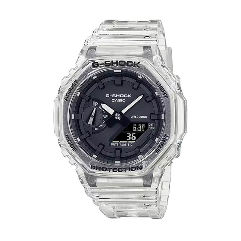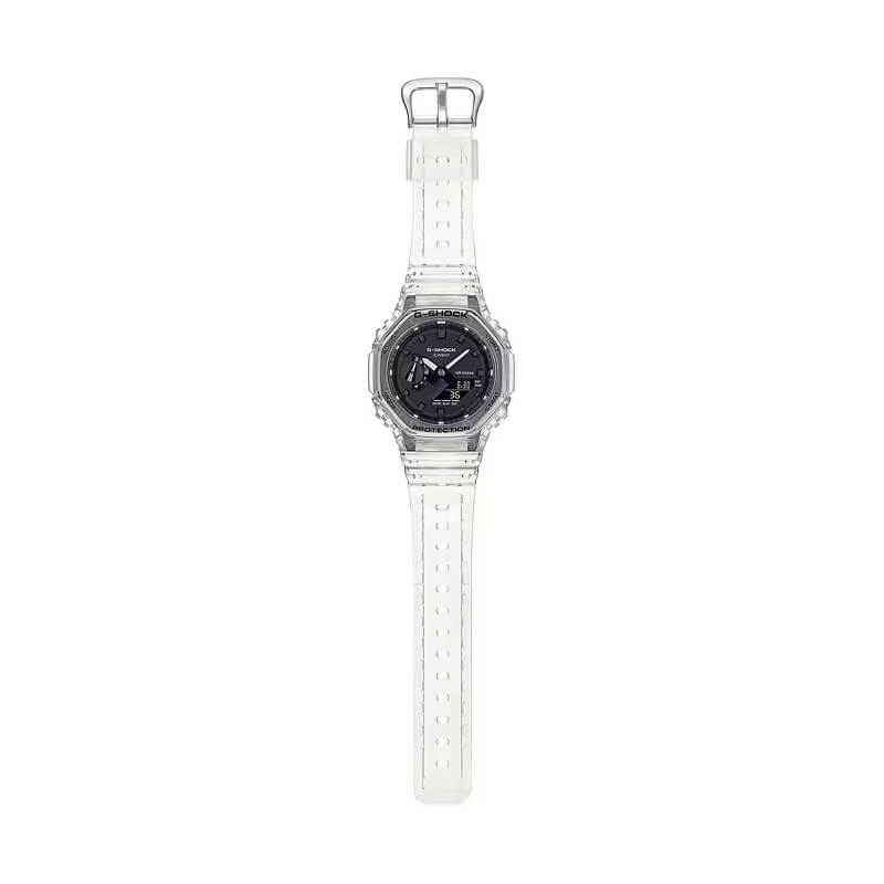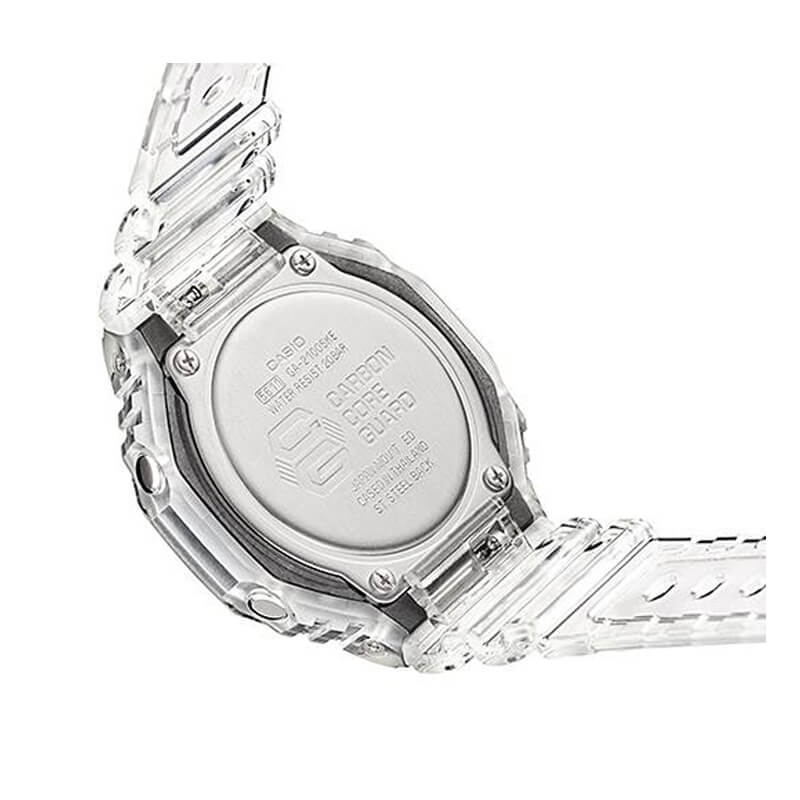 El G-SHOCK GA-2100SKE-7ADR es un reloj análogo-digital unisex que destaca por su diseño futurista y minimalista. Su caja octogonal en resina transparente tipo “Skeleton” revela una estética única y moderna, ideal para quienes buscan un accesorio funcional con estilo audaz.