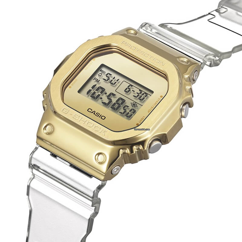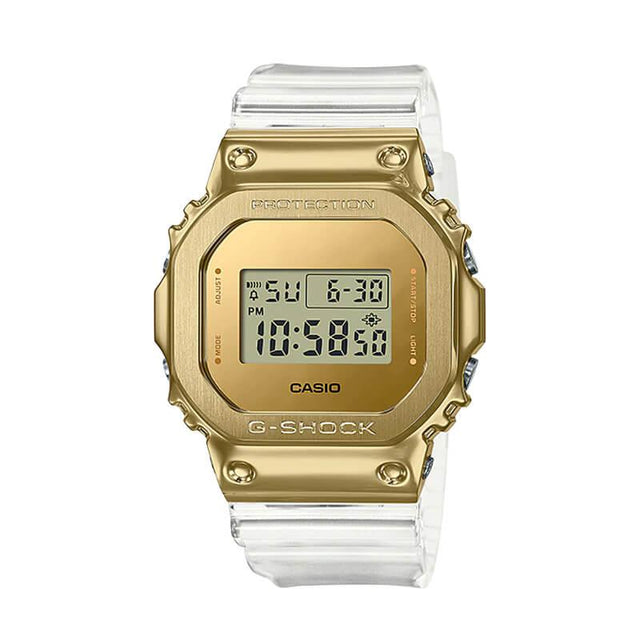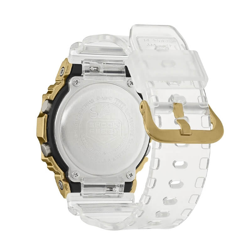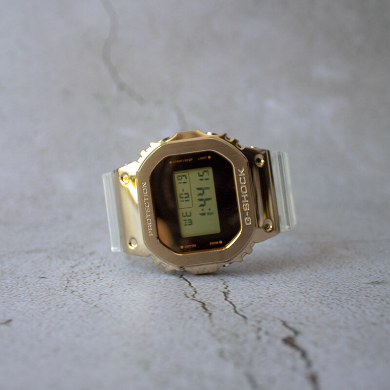 El G-SHOCK GM-5600SG-9 es un reloj digital unisex de estilo urbano con presencia llamativa. Su caja cuadrada mantiene la silueta clásica del 5600, pero con bisel metálico dorado que resalta sobre la correa de resina translúcida. Resistente a impactos y al agua (200 m), cuenta con cronómetro, temporizador, alarma y luz EL. Ideal para quienes buscan un reloj funcional y audaz, perfecto para el día a día o un look streetwear con actitud.
