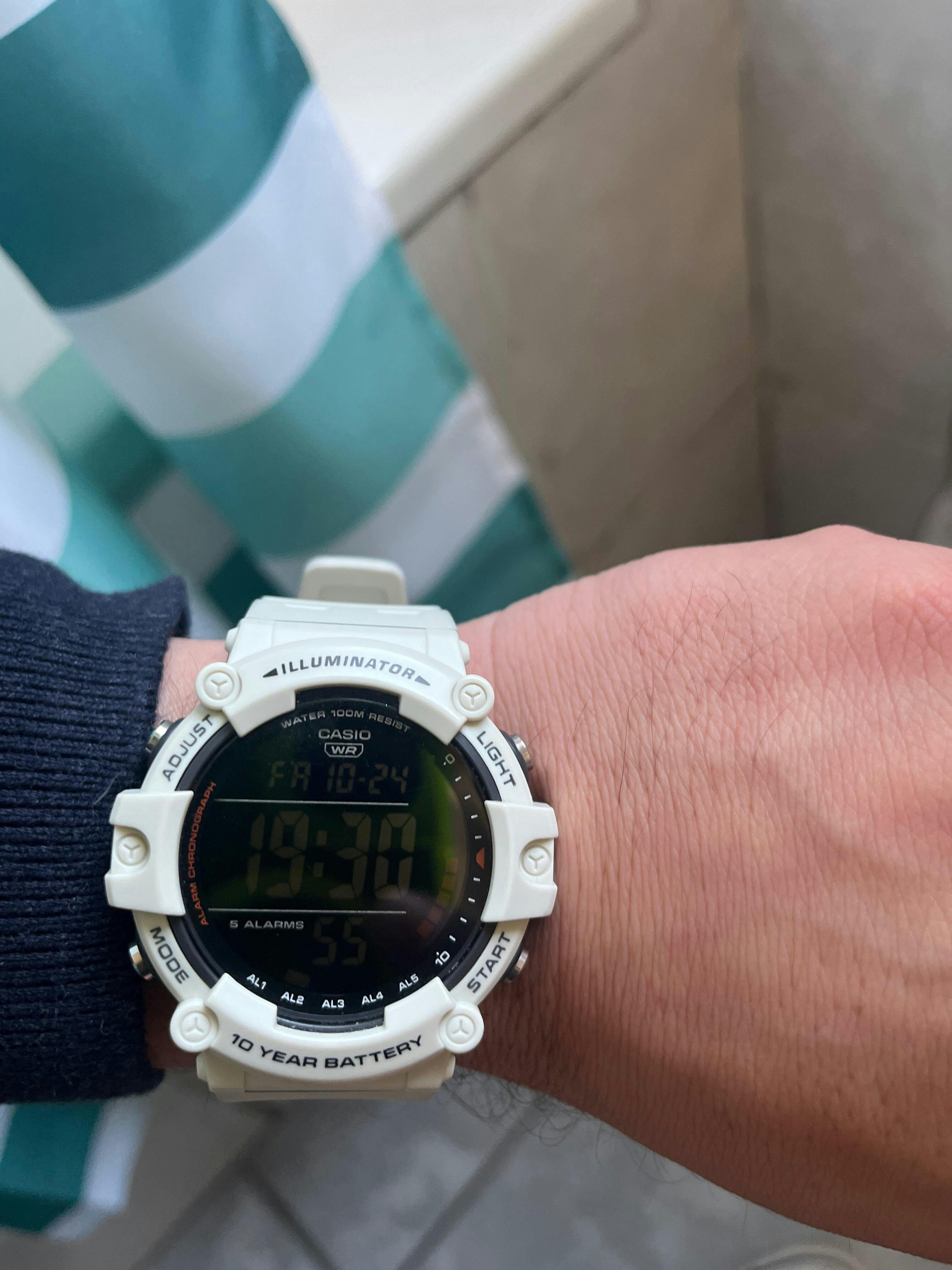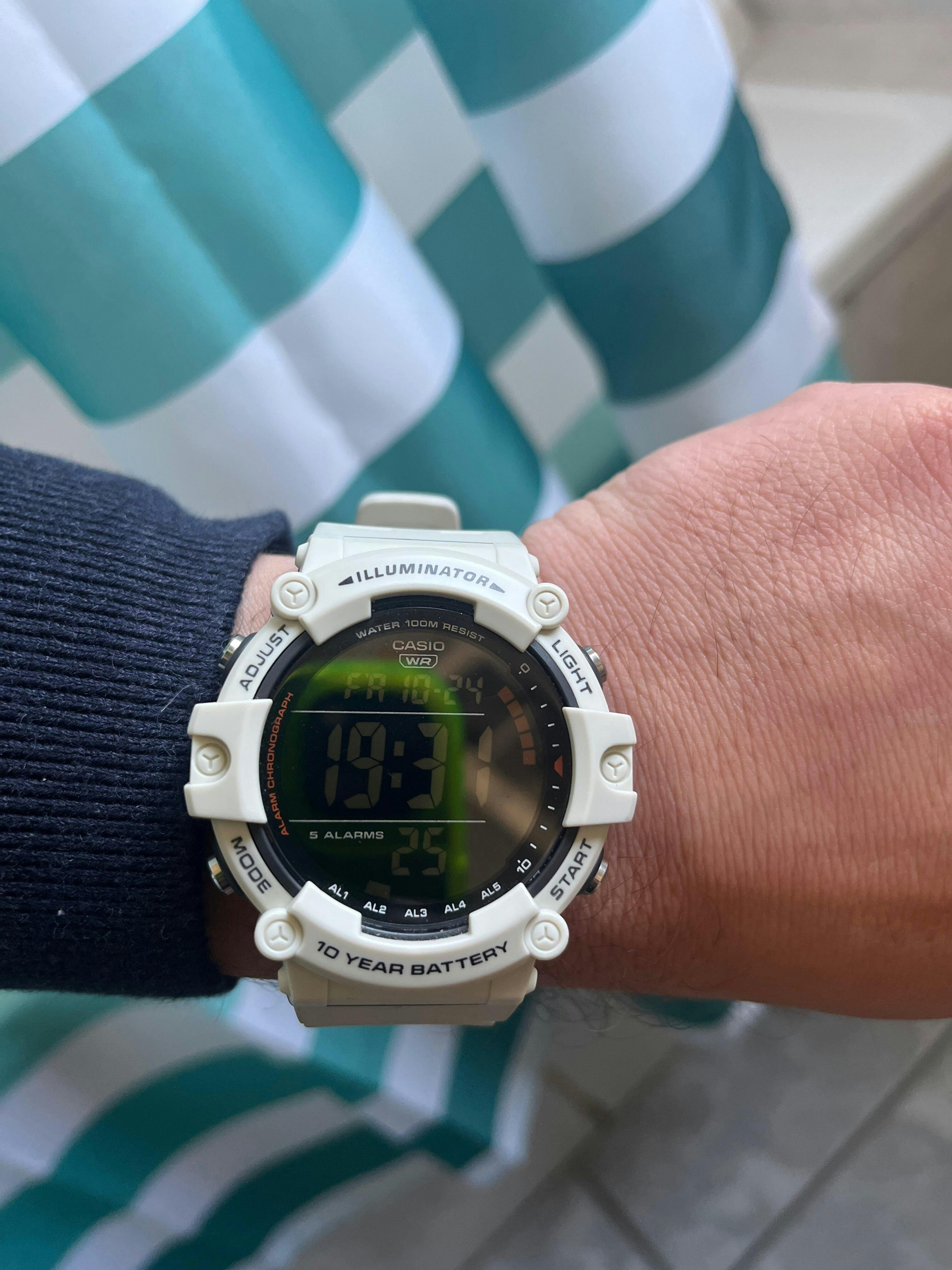 El Casio AE-1500WH-8B2V destaca por su diseño moderno con pantalla negativa, fondo negro y dígitos blancos extragrandes que ofrecen una lectura rápida y nítida. Su caja robusta de estilo deportivo y correa gris le dan un look masculino y funcional. Ideal para el uso diario, con cronómetro, alarmas, calendario y resistencia al agua de 100 m, combina estilo y practicidad en un solo reloj.