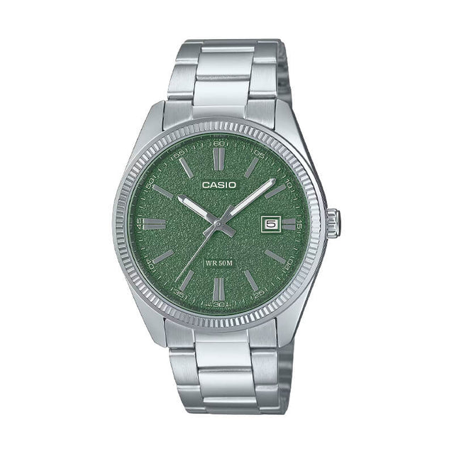 Con un estilo clásico y sofisticado, este modelo presenta una caja y correa de acero inoxidable combinadas con una elegante esfera verde metálica que aporta un toque distintivo y moderno. Los marcadores plateados, el calendario y el cristal mineral completan su diseño equilibrado y funcional.