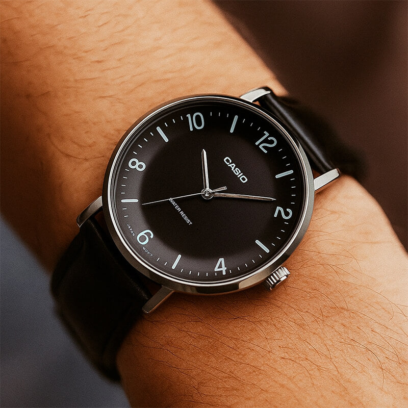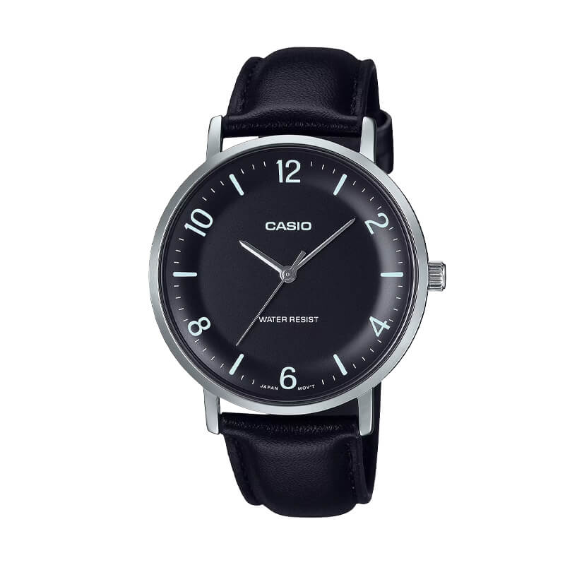 El Casio MTP-VT03L-1B combina una caja de resina cromada plateada con correa de cuero negro lisa, aportando un diseño elegante y sobrio. Su esfera negra de líneas limpias con índices delgados y agujas metálicas le da un aire minimalista y contemporáneo.
