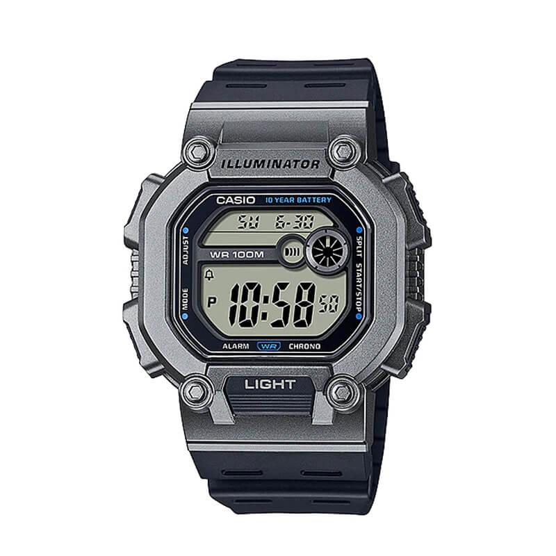 El Casio W-737H-1A2V es un reloj digital deportivo con caja robusta de resina grafito y acentos azul eléctrico que le dan un estilo dinámico. Su pantalla grande y clara facilita la lectura en movimiento. Incorpora cronómetro con memoria de vueltas, temporizador, 5 alarmas, hora dual, calendario automático y luz LED. La correa de resina es cómoda y resistente. Con resistencia al agua hasta 100 metros, es ideal para entrenamiento, deportes o rutina activa.