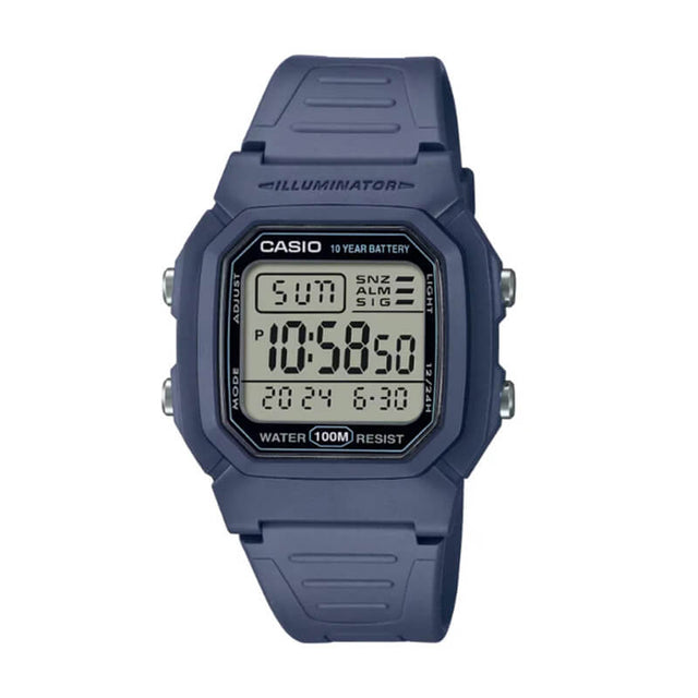 El Casio W-800H-2A incorpora una caja de resina azul con correa del mismo material y detalles en azul en el bisel que aportan un toque moderno y deportivo. Su pantalla digital de gran tamaño ofrece una lectura clara y práctica, diseñada para quienes valoran funcionalidad y estilo sobrio.