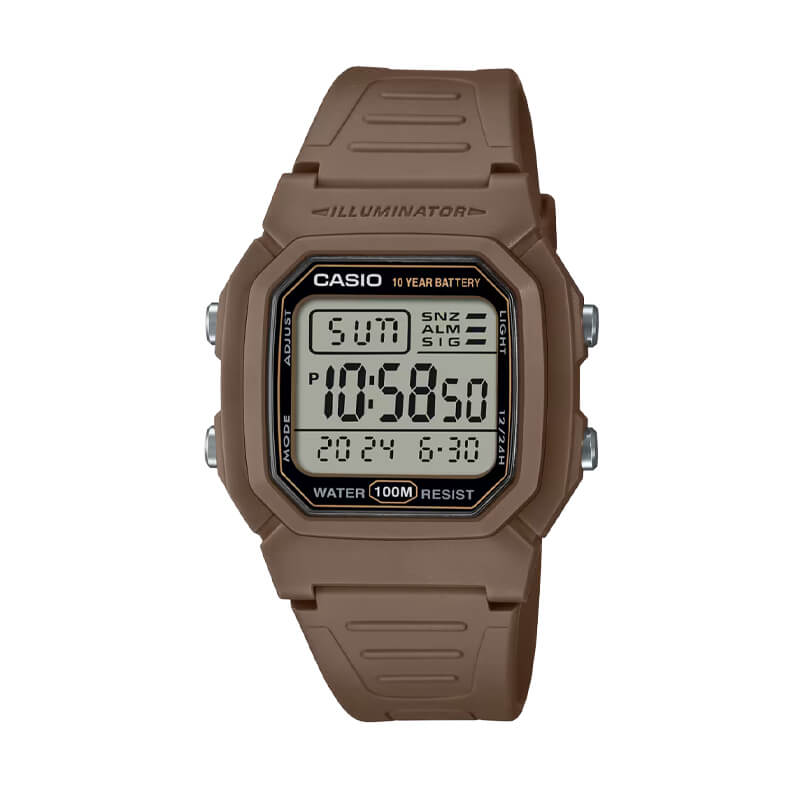 El Casio W-800H-5A combina una caja de resina en acabado marrón oscuro con correa de resina del mismo tono, logrando un diseño deportivo con un aire distintivo. Su pantalla digital amplia con dígitos de alto contraste asegura una lectura clara y rápida en cualquier situación.