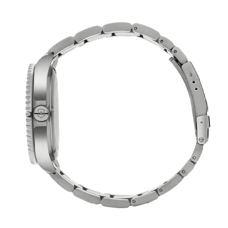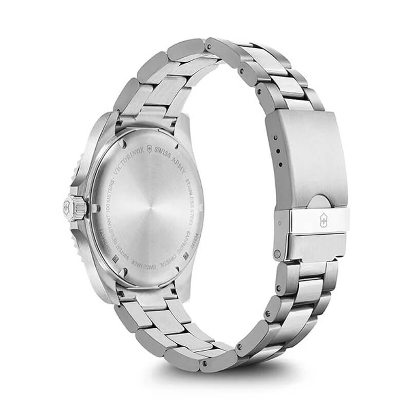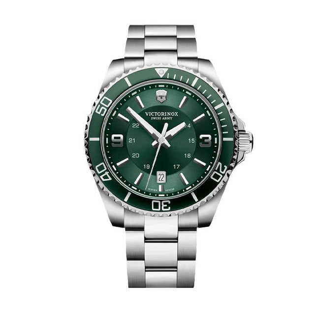 El Victorinox Maverick Large 241934 luce una estética refinada con su caja y brazalete de acero inoxidable de acabado satinado/pulido, complementados por un bisel giratorio unidireccional verde a juego con la carátula cepillada. Su dial verde con numerales árabes y puntos luminiscentes Super-LumiNova® aporta legibilidad y dinamismo, mientras que sus dimensiones (43 mm de diámetro y solo 11 mm de grosor) garantizan presencia y comodidad
