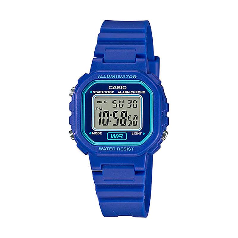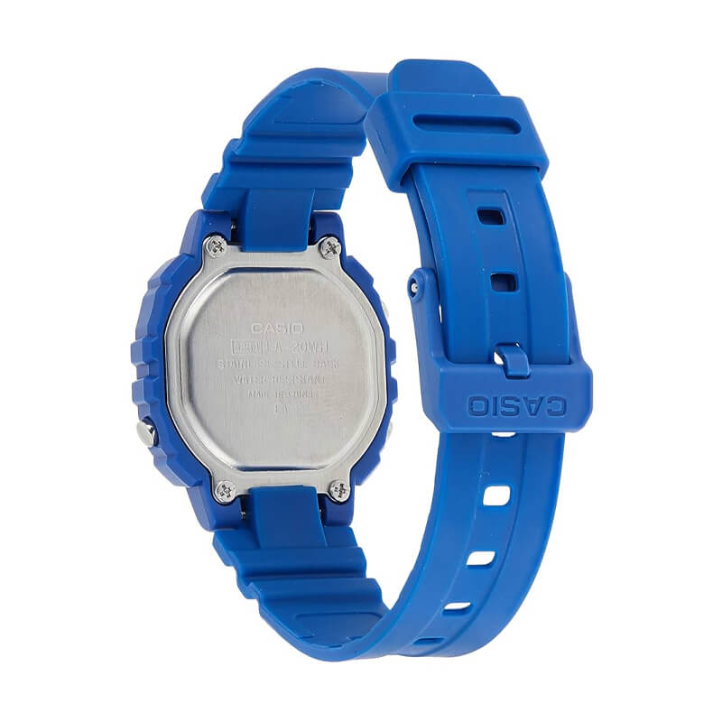 El Casio LA-20WH-2A es un reloj digital compacto y ligero, ideal para uso diario con un estilo casual y juvenil. Su caja de resina azul mantiene el diseño clásico de la línea, mientras que su correa flexible ofrece comodidad prolongada.